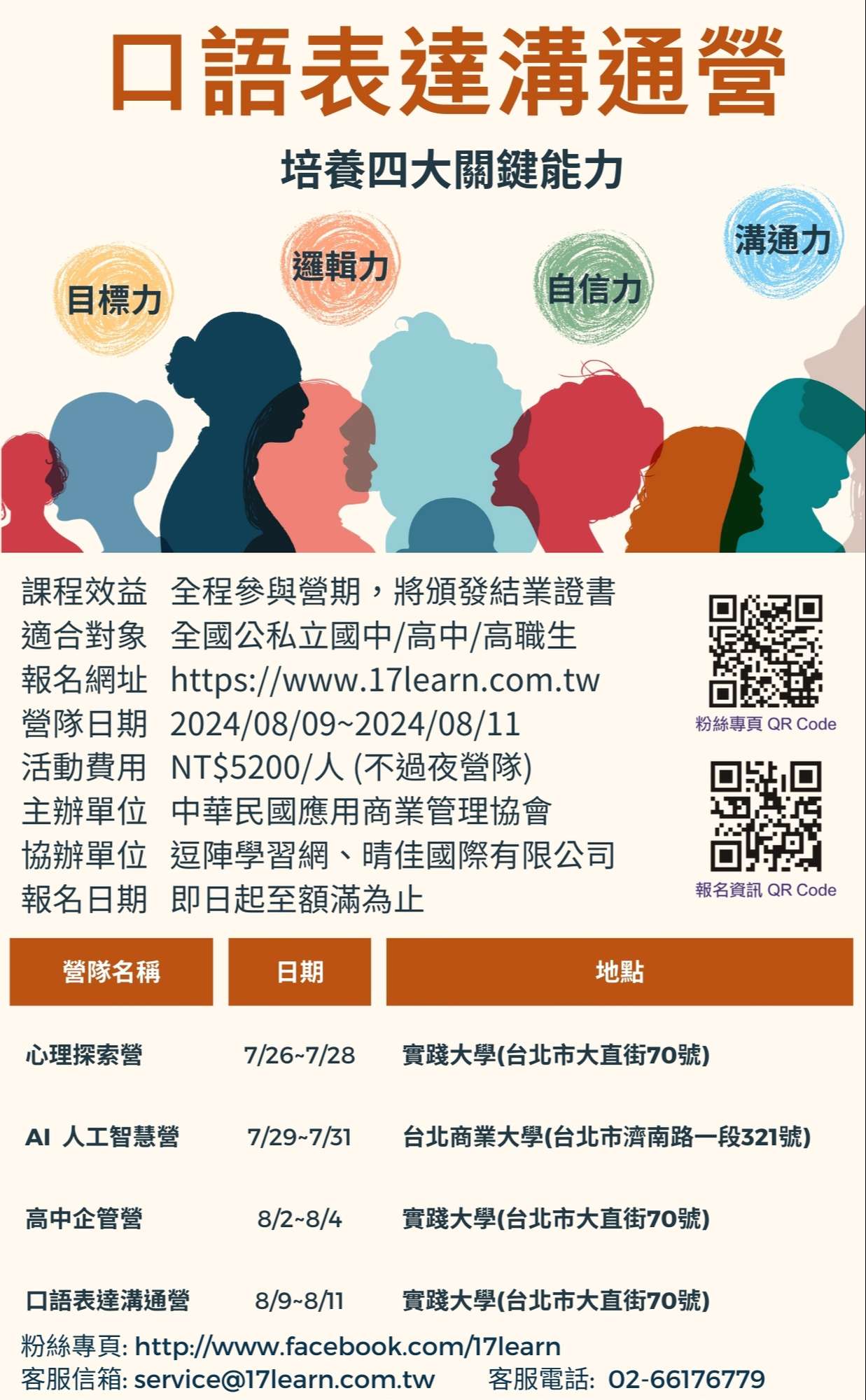 無論是升學口試或求職面談,口語表達已經是現代人不可 或缺的軟實力。「口語表達溝通營」透過講解、示範、訓 練和不斷的演練,克服公開發言的恐懼,人人都可以成為 口語表達的高手!