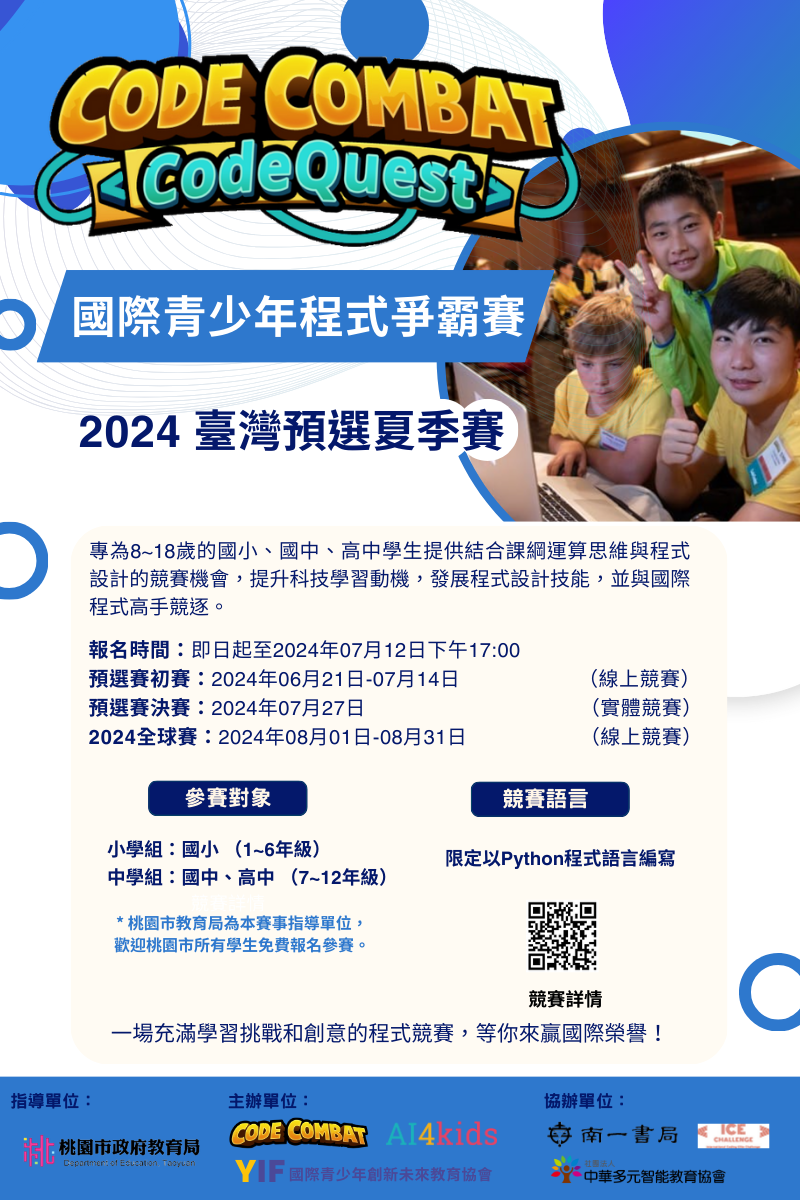 一、2024年暑假,社團法人國際青少年創新未來教育協會攜手 AI4kids、南一出版社、中華多元智能教育協會,為8~18歲 的國小、國中、高中學生提供結合108課綱資訊素養的運算 思維暨程式設計競賽機會,提升科技學習動機,發展程式 設計技能,並與國際程式高手競逐。