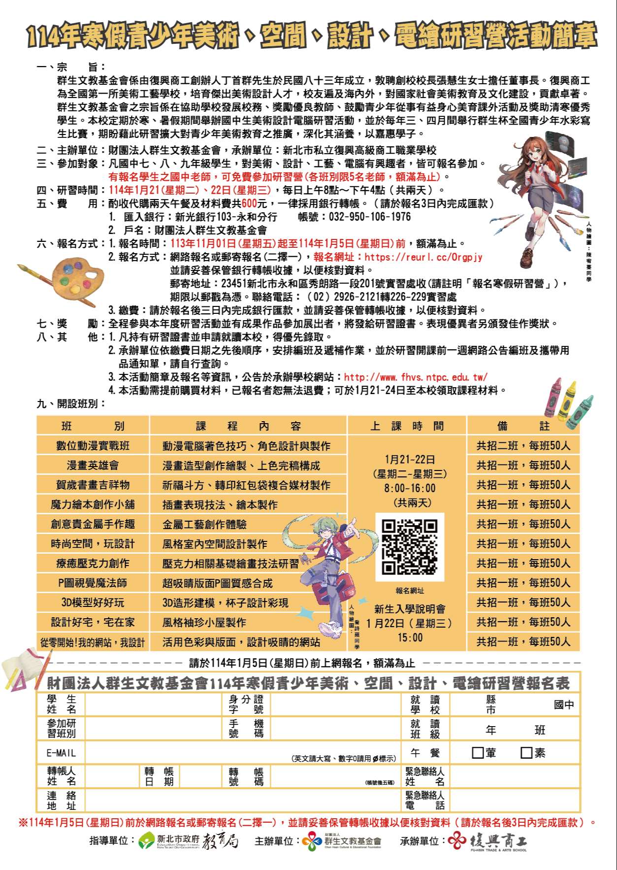 七、報名時間:113年11月01日(星期三)起至114年1月05日(星 期五)前,額滿為止。任何課程相關問題,聯絡電話(02) 2926-2121轉226~229。