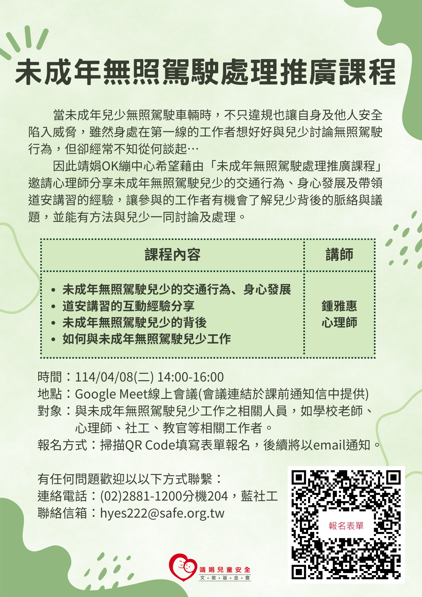 主旨:函轉財團法人靖娟兒童安全文教基金會OK繃兒童服務中心 辦理114年度「未成年無照駕駛處理推廣課程」一案,請 查照。