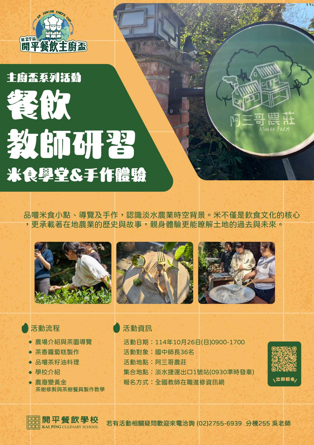 四、報名方式:採線上報名,請上“全國教師在職進修資訊網” 報名,課程名稱:餐飲教師研習_米食學堂&手作體驗。報 名截止日期:114年10月23日(三),課程名單將於開課前三 天確認遴選名單。
